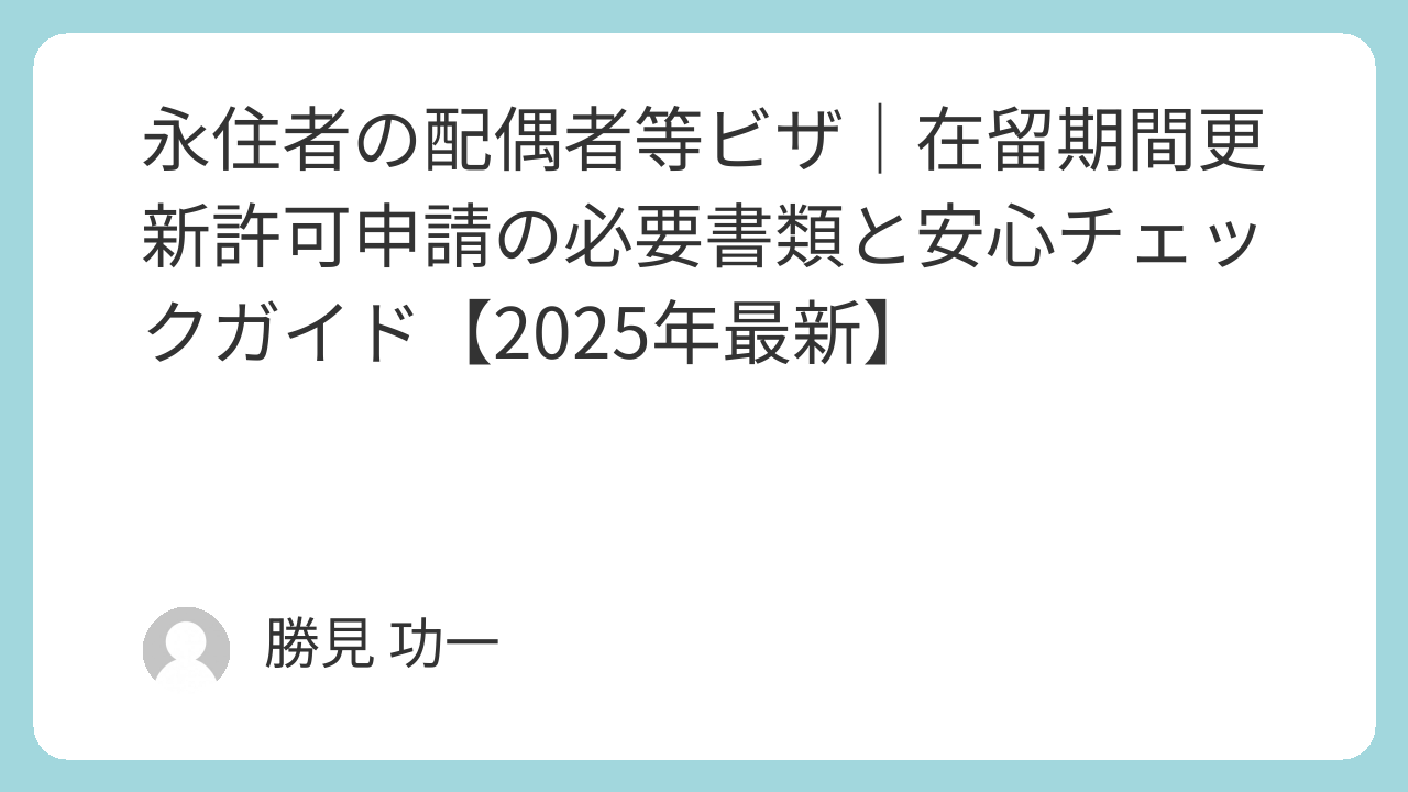 永住者の配偶者等ビザで日本に在留中の方にとって、在留期間更新許可申請は継続して日本で生活するための大切な手続きです。しかし、「何を準備すればいい?」「必要書類にミスはない?」と不安に感じる方も多いのが実情です。本記事では、法務省の最新ガイドラインと実務経験をもとに、永住者の配偶者等ビザの在留期間更新許可申請に必要な全書類と、書類ごとの注意点、不許可やトラブルを防ぐ実践的アドバイスまで詳しく解説します。