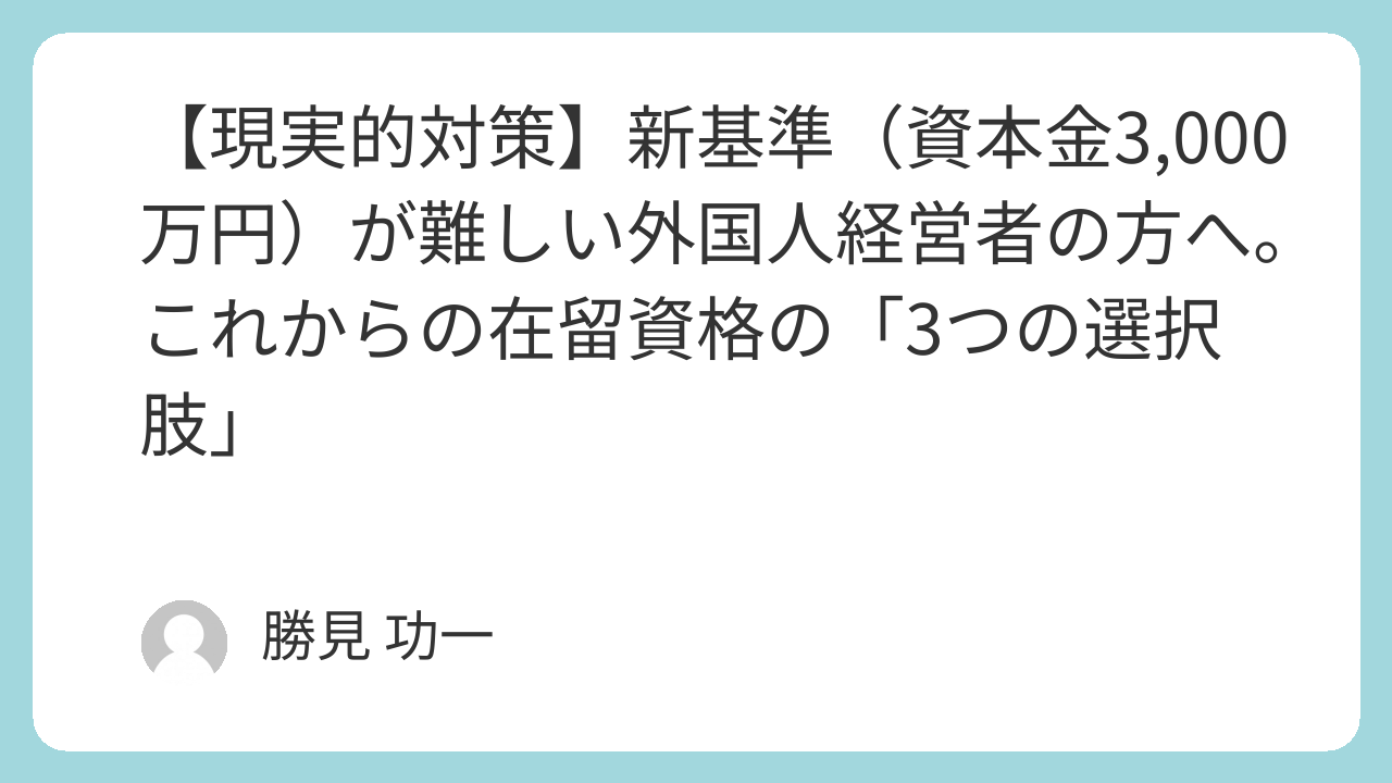 新基準(資本金3,000万円等)は小規模事業を営む外国人経営者の大半にとって、事実上の「退場勧告」と言えるほどの厳しいものであり、正直専門家からもその妥当性に疑問を呈する声は大きいです。