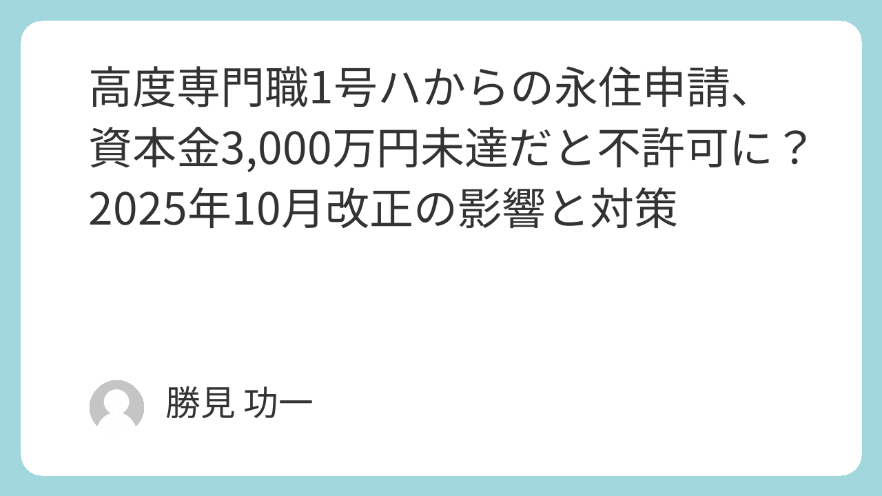 高度専門職1号ハを保有し、永住等を計画されている方へ重要なお知らせです。2025年10月16日に施行された経営・管理ビザの基準省令改正により、永住許可申請時には改正後の新基準(資本金3,000万円、常勤職員1名以上、日本語N2相当など)への適合が必須となりました。多くの方が誤解されているようですが、在留期間更新には3年間の経過措置がある一方で、永住申請や高度専門職2号への変更には経過措置が適用されません。つまり、ポイントが80点あっても、資本金が500万円のままでは永住申請が不許可となるリスクが極めて高い状況です。本記事では、既存保持者が直面する深刻なリスクと、今すぐ取るべき具体的な対策を京都の行政書士が詳しく解説します。